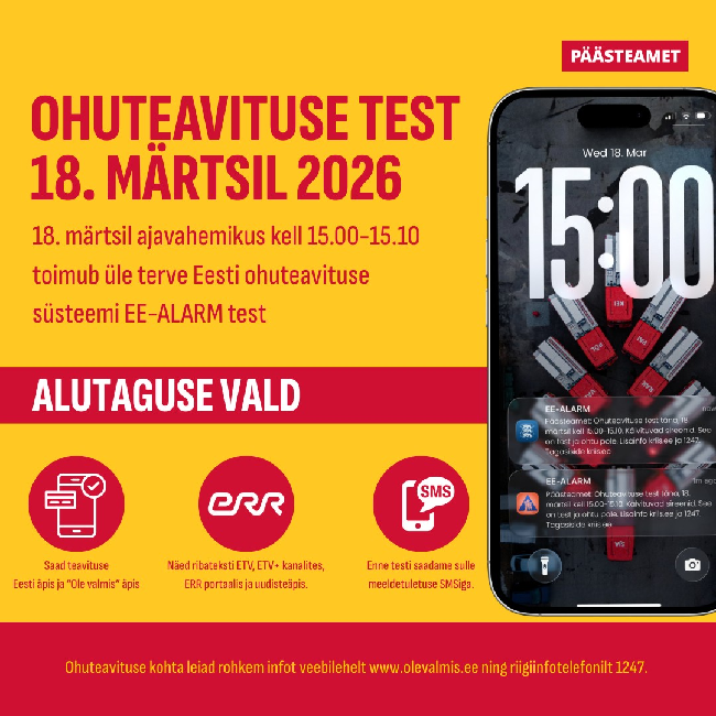 Järgmine ohuteavitussüsteemi test toimub 18. märtsil 2026. Kui ühelt poolt on tegemist süsteemi töökindluse kontrollimisega, siis teisalt on see elanikkonnale suurepärane võimalus läbi mõelda, kuidas ohuolukorras päriselt tegutseda. Just inimesed ehk ohuteavituse vastuvõtjad on kogu teavitussüsteemi olulisim lüli ning seetõttu on teadlik käitumine hindamatu väärtusega.
