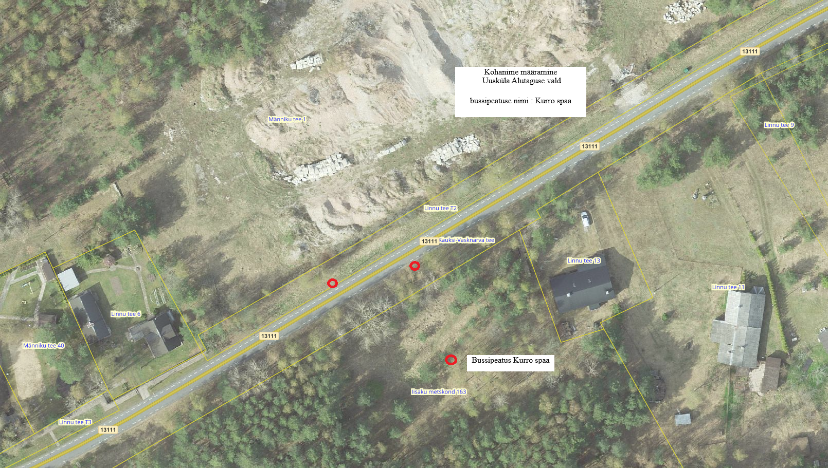 Võttes aluseks Kohaliku omavalitsuse korralduse seaduse § 6 lg 3 p 1 ja § 7 lg 2, Ühistranspordiseaduse § 73 lõike 3, keskkonnaministri 16.06.2021. a määruse nr 32 „Aadressiandmete süsteem", Kohanimeseaduse § 3 lõike 7 punkti 1, § 4 lg 1 p 5, § 5 lg 1 p 3 ja lg 4, § 6 lg 1 ja lg 2, Alutaguse Vallavolikogu 21.12.2018. a määruse nr 13 "Kohanimeseaduses ja ruumiandmete seaduses kohalikule omavalitsusele pandud ülesannete delegeerimine Alutaguse Vallavalitsusele", Alutaguse Vallavolikogu 22.11.2018 määruse nr 79 „Kohanime määramise eelnõu avalikustamise kord" ja 18.11.2025 kuni 03.12.2025 valla kodulehel avalikustatud eelnõu, mille käigus esitati/ei esitatud ettepanekuid ega vastuväiteid (täiendatakse pärast avalikustamist), Alutaguse Vallavalitsus annab