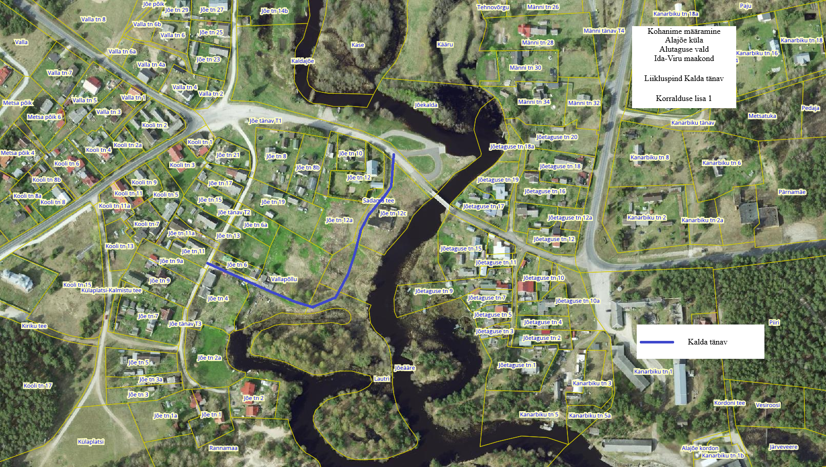 Alutaguse Vallavalitsuse 09.04.2025 istungil otsustati avalikustada korralduse eelnõu „Kohanime määramine (Kalda tänav, Alajõe küla)" ning vastavalt Kohanimeseaduse § 6 lõikele 8 avalikustada ja avaldada eelnõu valla kodulehel 10.aprillist kuni 25. aprillini 2025 ettepanekute ja vastuväidete esitamiseks. Ootame ettepanekuid ja vastuväiteid kirjalikult e-posti aadressile info@alutagusevald.ee.