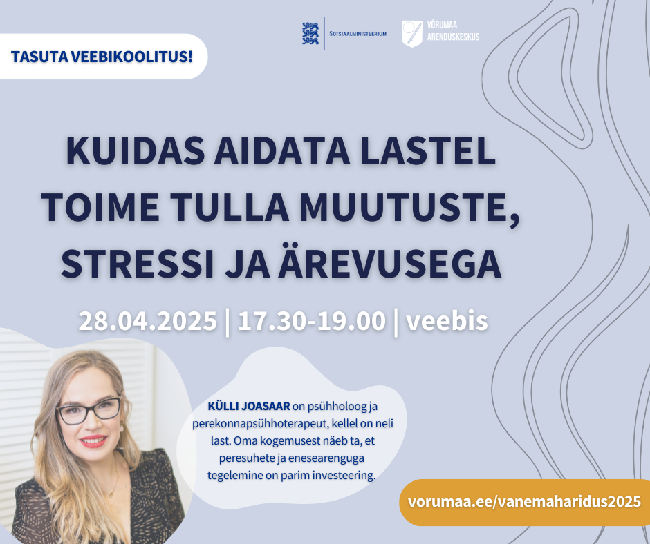 Kutsume kõiki lapsevanemaid ja laste ning noortega tegelevaid spetsialiste veebikoolitusele: Kuidas aidata lastel toime tulla muutuste, stressi ja ärevusega.